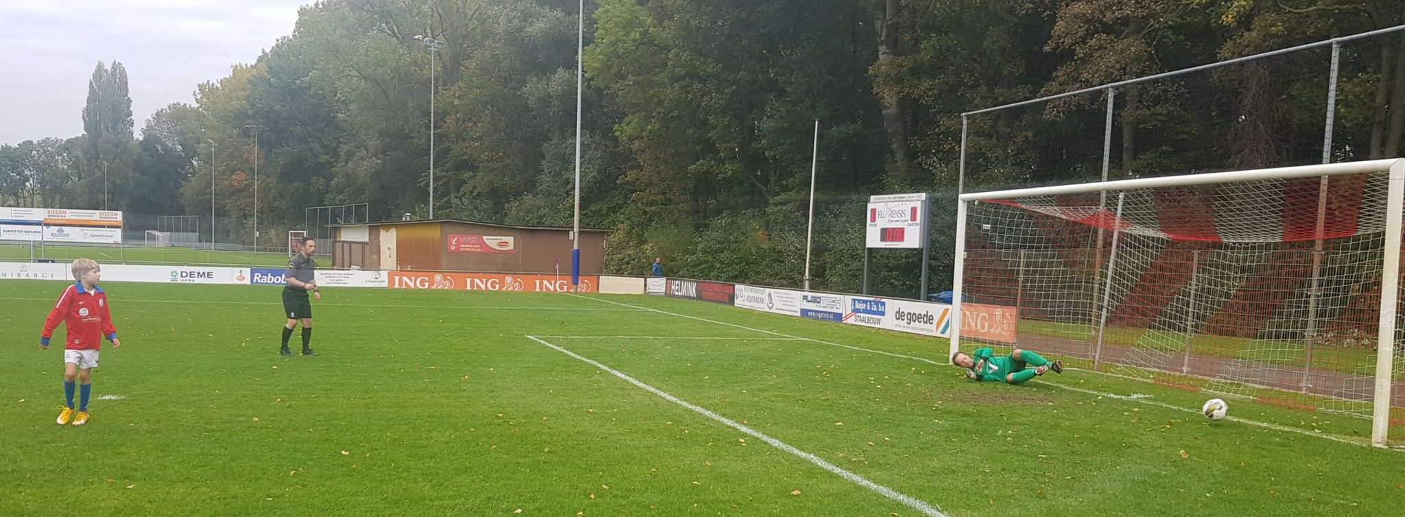 een strafschop, die door Guus onberispelijk wordt benut door de keeper naar de verkeerde hoek te sturen.