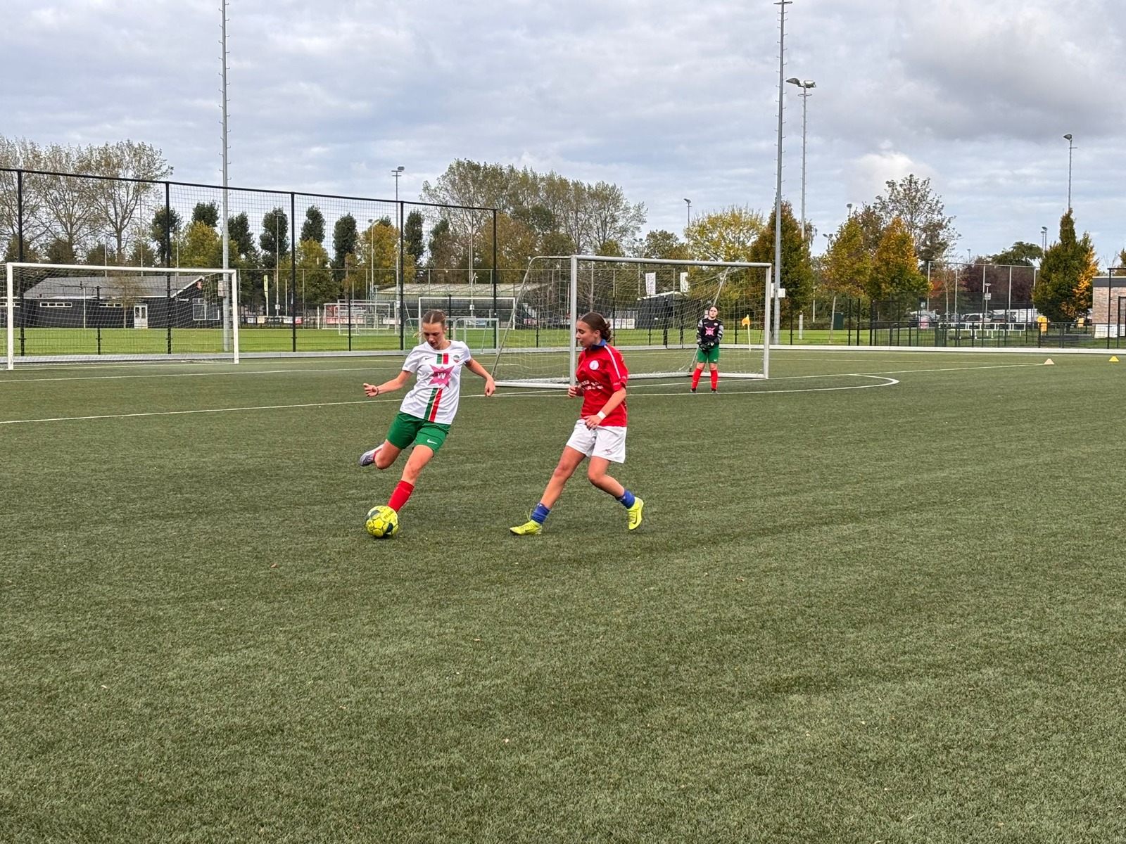 In het begin leek het alsof onze meiden wat onder de indruk waren van de tegenstander: binnen een kwartier stond het 2-0. Gelukkig wist Thari de aansluitingstreffer te maken, maar voor rust liep De Alblas uit naar 4-1. In de rust werd er overlegd dat het niet helemaal eerlijk was om bijna het hele hogere team op te stellen. De tweede helft werd dan ook gespeeld met de eigen speelsters van De Alblas – en dat was te merken!