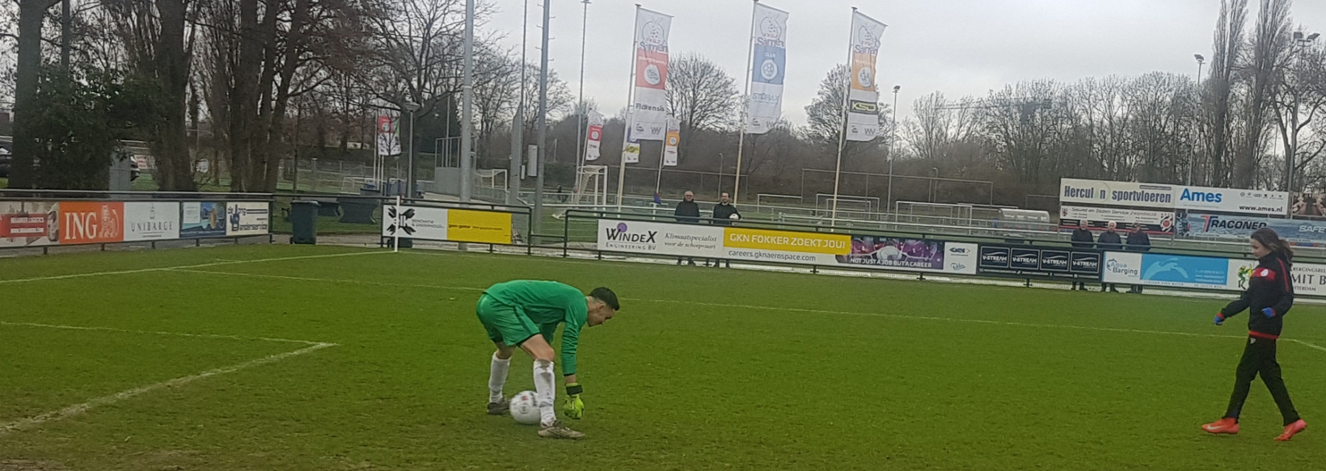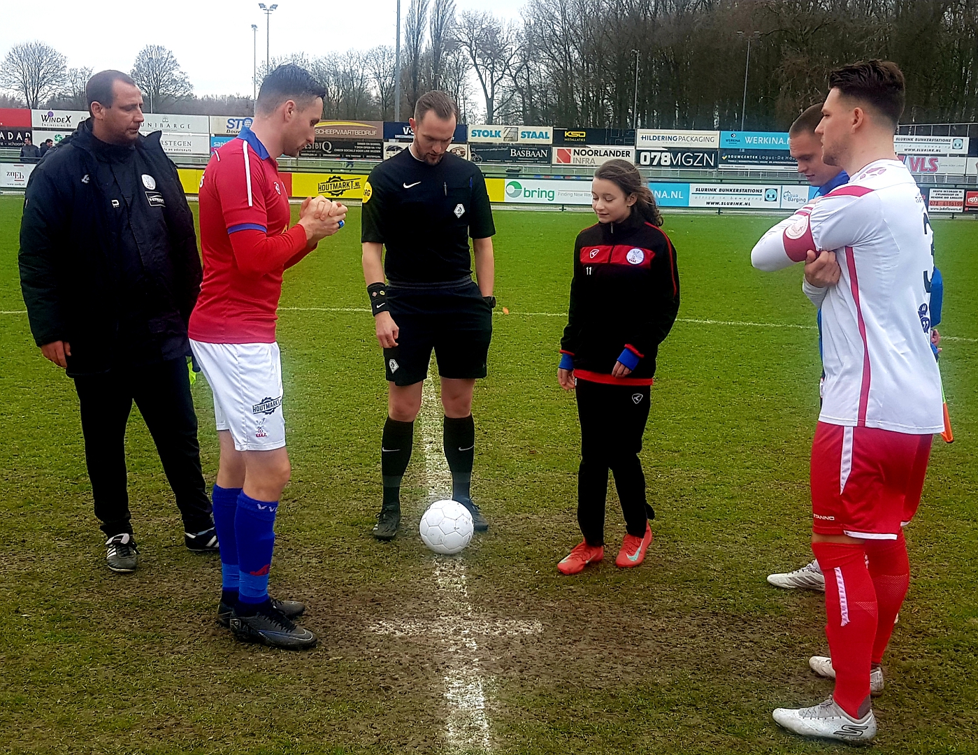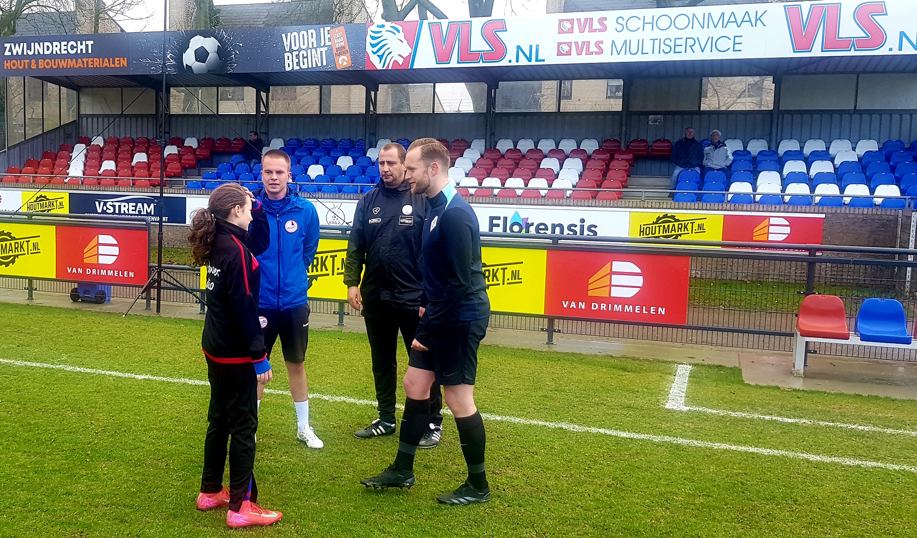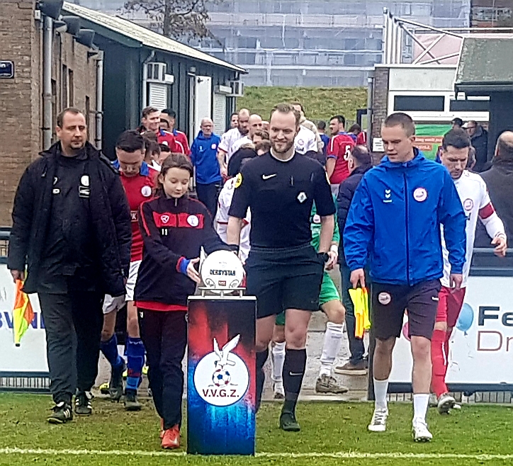 Voor aanvang van de wedstrijd kregen deze keer de grensrechters Erik Zwaan van VVGZ en Tom Dolk van Hellevoetsluis hun instructies van scheidsrechter Gideon Begeer voor het in goede banen leiden van de wedstrijd op het veld en was Lola een aandachtig toehoorder.