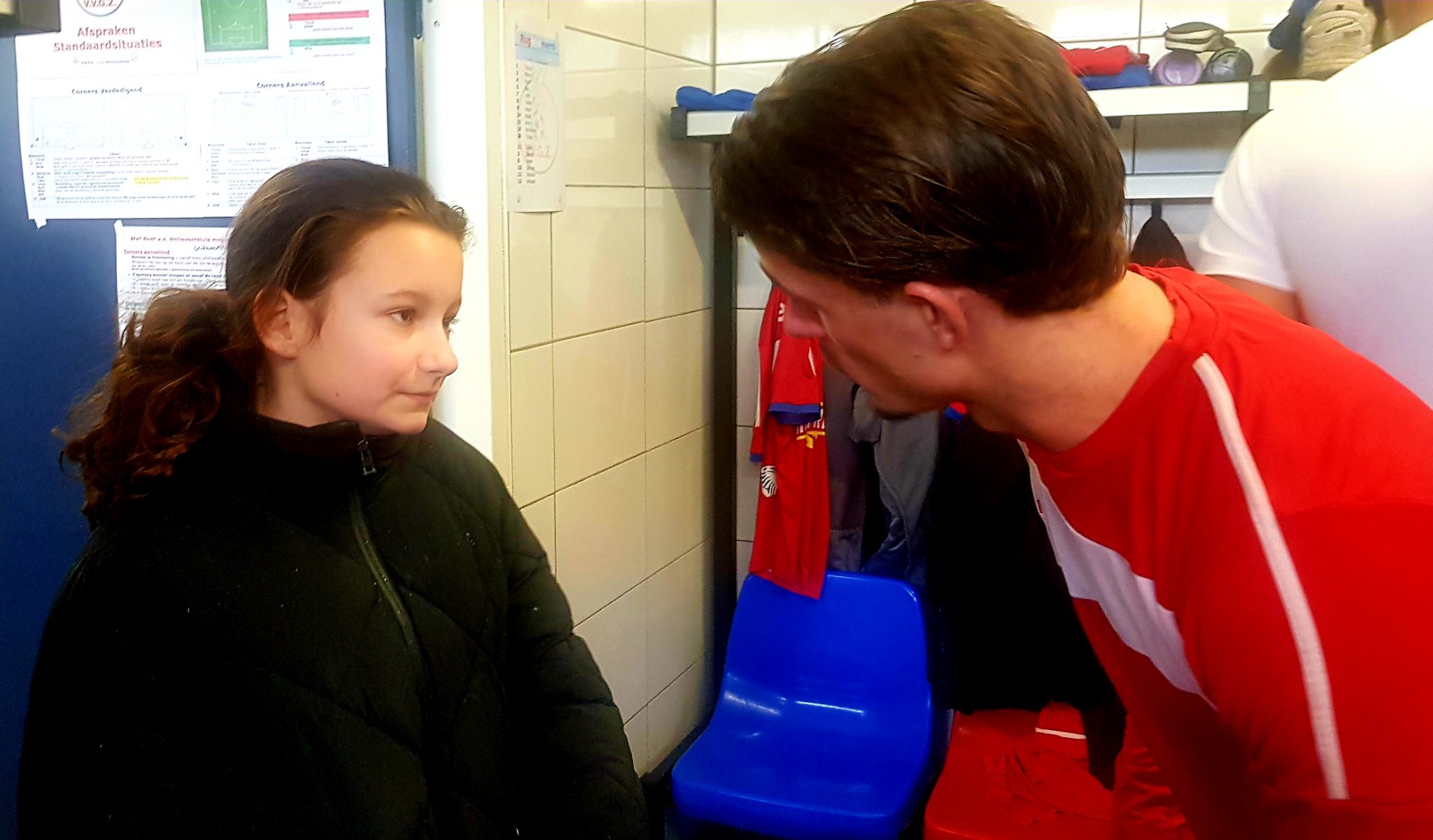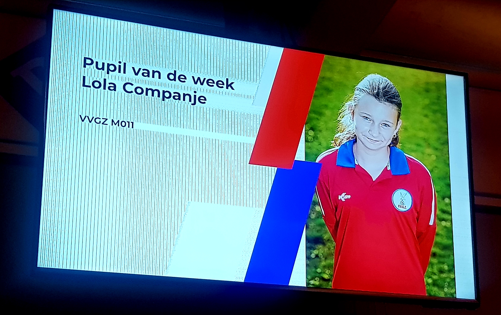 en snacks met de selectie en kon Lola op het televisiescherm in de kantine zien, dat zij vandaag Pupil van de Week was.