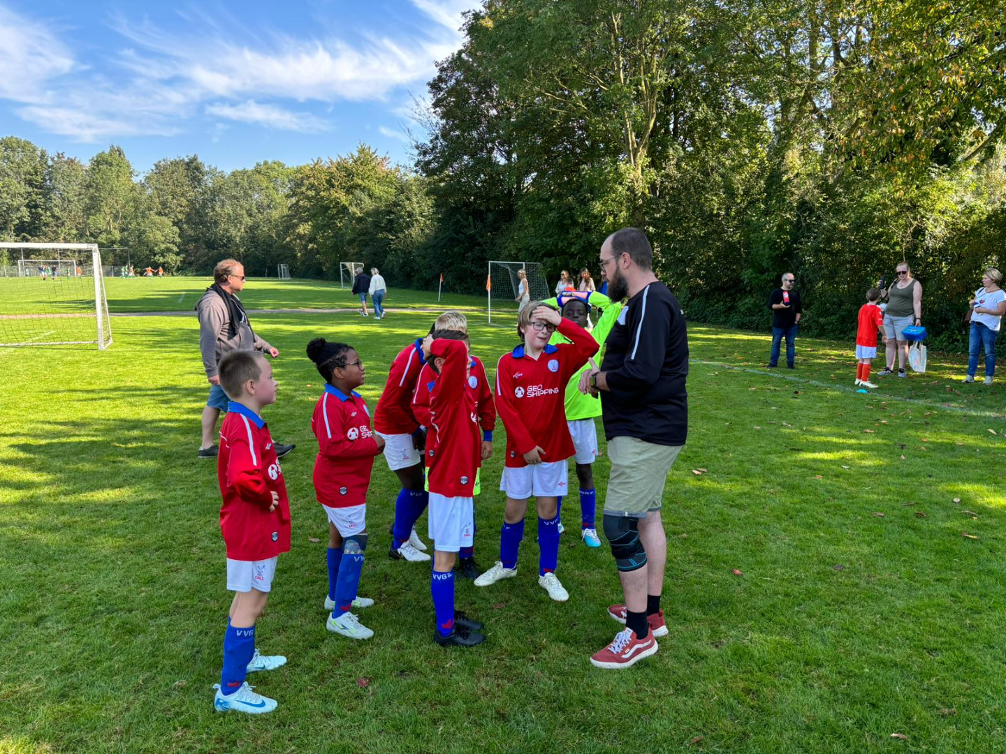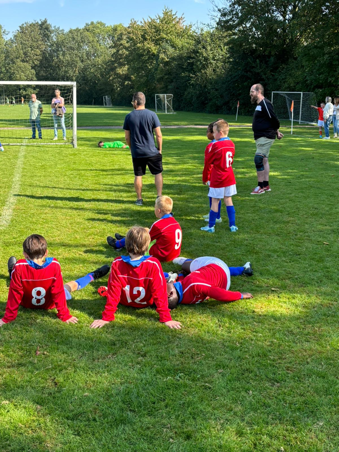De afgelopen trainingen zijn we bezig geweest met de kracht van een pass en goed getimde steekballen en dit zien we terug in de wedstrijd! Zo ontstaat er goed spel tussen Quin en Yannis, wat de helft van de wedstrijd op 1-8 brengt. Zoals afgesproken gaat Yannis de tweede helft op goal en Destiny aan de kant. Quin wil graag starten op het middenveld om wat meer eigen ruimte te creëren. Dit betaald zich heel snel uit met een mooie en meer dan verdiende bal op goal voor de 1-9. De spellers keren na een actie snel terug op hun positie en hebben maar een kleine ondersteunende opmerking van de zijlijn nodig om te snappen wat de bedoeling is en voeren dit perfect uit. Railey, die in de spits mocht starten dit kwart, geeft verschillende mooie ballen aan zijn teamgenoten, met kansen voor Valerie en Brick, maar weet uiteindelijk met een mooie eigen actie zelf te scoren voor de 1-10 en gaat daarna gezien de stand in de verdediging spelen. De ouders aan de zijlijn weten niet wat ze overkomt en bespreken het ontbijt van de spelers deze morgen en of dit invloed kan hebben gehad. Quin is op dreef met een hard shot op de keeper, maar deze houdt hem niet klem en Quin legt zijn tweede er in vanuit de rebound voor de 1-11. De tegenstander weet, door met twee spelers goed te jagen op Railey, de bal te veroveren en maakt een verdiende goal; 2-11. Railey laat dit niet zomaar gebeuren en met een lang onhoudbaar shot vanaf de middellijn passeert hij de keeper voor de 2-12. Brick heeft zijn zinnen gezet op ook een goal en breekt tot 2x toe door over de flank en komt met een mooie dribbel voor de goal. De eerste gaat naast, maar de tweede keer speelt hij de keeper uit en met een hakbal weet hij te scoren. Ondertussen is Valerie doorgeschoven naar de aanvalspositie en op aangeven van Railey ontstaat er een bijzonder maar ook spannend moment, waar Valerie met een hard schot onderkant lat raakt waarna de bal stuitend hard naar beneden komt. De keeper reageert snel en pakt de bal. Iedereen is stil en kijkt elkaar aan! Zat de bal er in? Was die over de lijn? De trainers kijken naar elkaar met de zelfde vraag, maar een opa van de tegenpartij die naast de goal staat is resoluut en wijst naar de middenstip! Goal van Valerie, niet zomaar een spannende goal voor de 2-14, maar ook bijzonder dat dit haar allereerste goal is in haar voetbalcarrière! Iedereen is blij en feliciteerde haar met de goal, waarna ze zelf een Tjakka gebaar maakt! Hiermee is de wedstrijd geëindigd! Gedreven als ze hierdoor waren wisten we ook de penalties reeks ruim te winnen met spin achtige reddingen van Yannis! Had ik al gezegd hoe trots ik ben op dit team, wat met plezier starte, doelpunten scoorde, zelfs nog meedacht aan het plezier van de tegenstander en de wedstrijd overtuigend wist te winnen? Maar de volgende wedstrijd begint weer met 0-0. We kijken er met plezier naar uit.